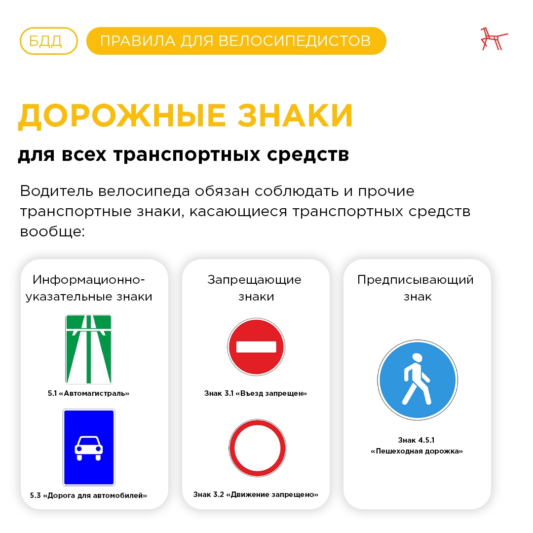 Центр по профилактике ДДТТ Института воспитания собрал для вас правила дорожного движения для велосипедистов и регулирующие движение дорожные знаки.