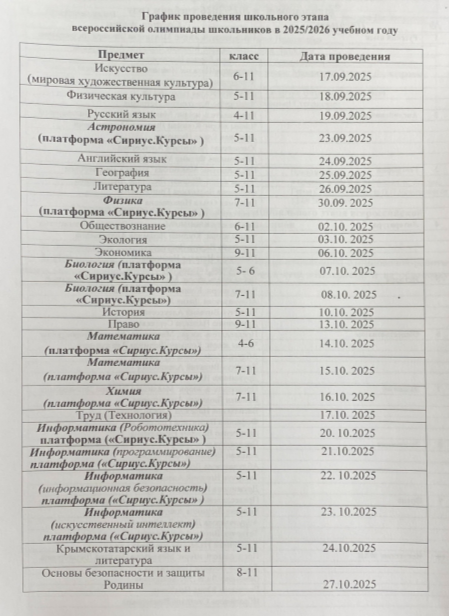 График проведения школьного этапа Всероссийской олимпиады школьников